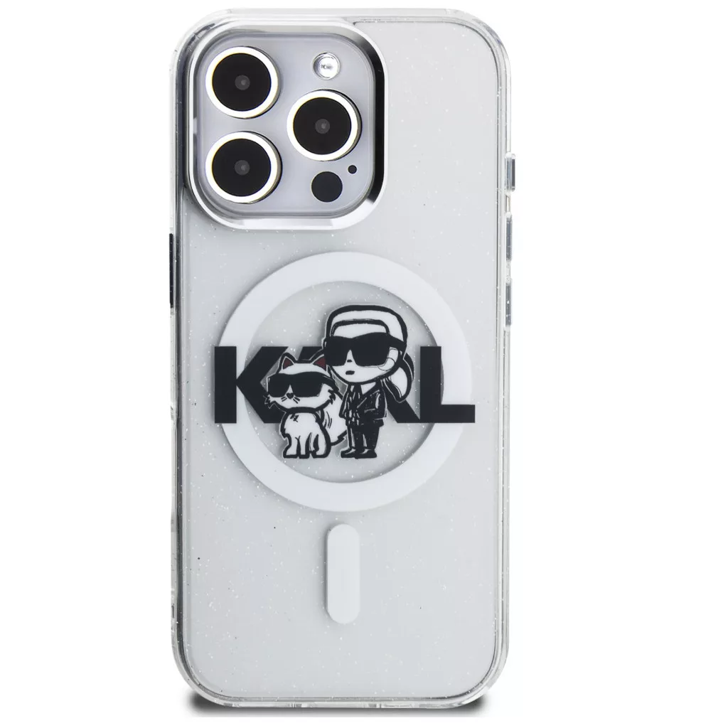 Karl Lagerfeld IML Glitter Karl and Choupette Sketch iPhone 16 Pro Max MagSafe kompatibilis hátlap tok, átlátszó