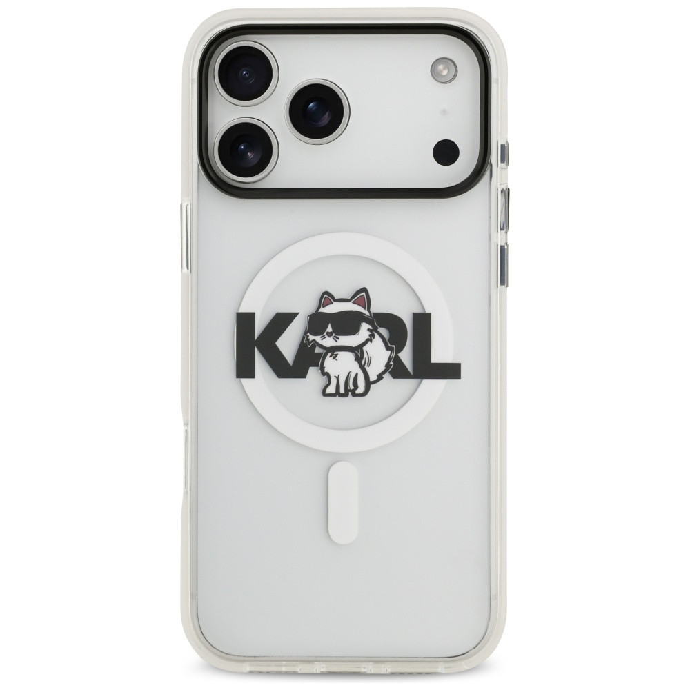 A hátoldalt Choupette macska nyomtatott motívuma díszíti, nagy KARL felirattal, kiegészítve egy látható MagSafe gyűrűvel.