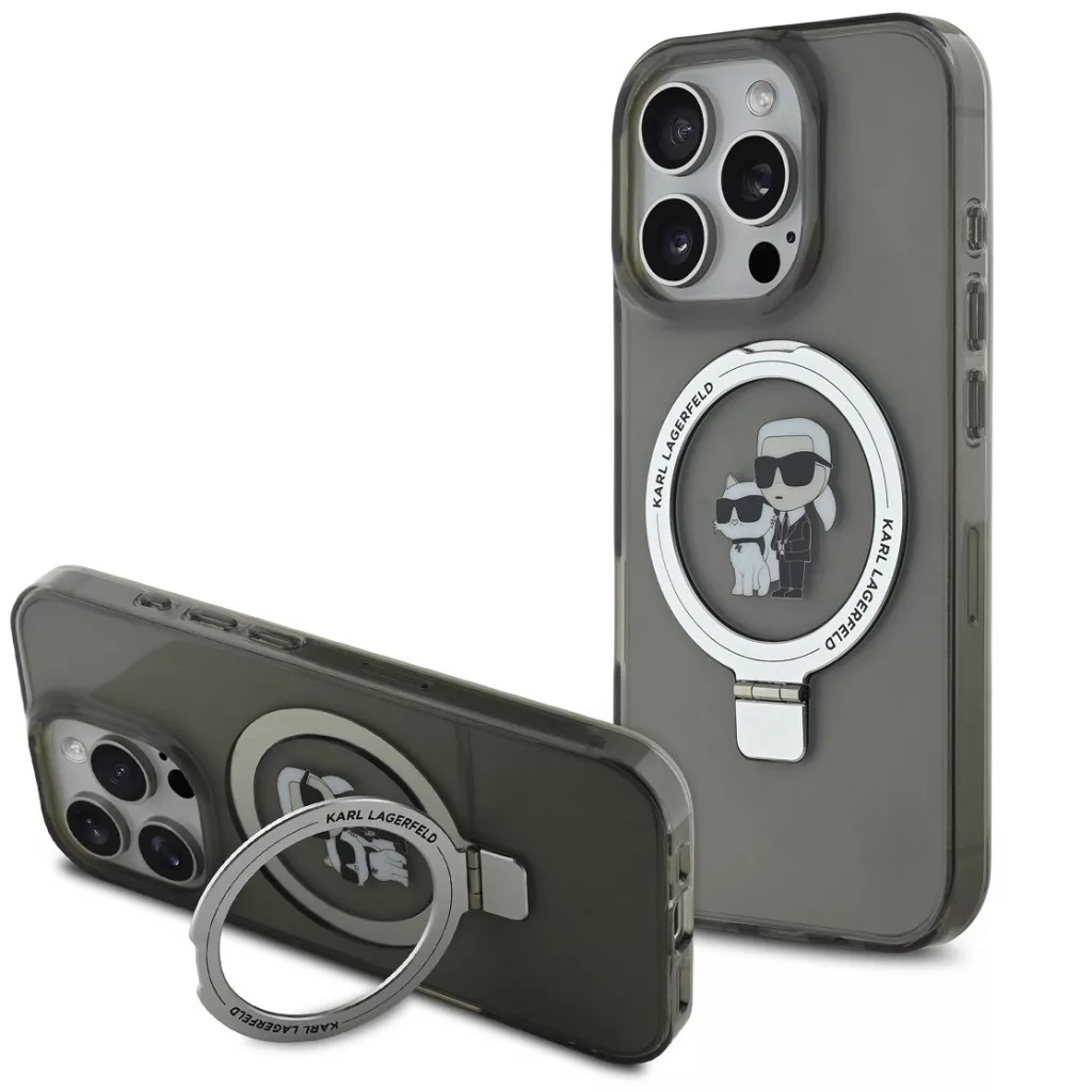 Karl Lagerfeld Ringstand Karl and Choupette iPhone 15 Pro Max MagSafe tok kitámasztóval, fekete
