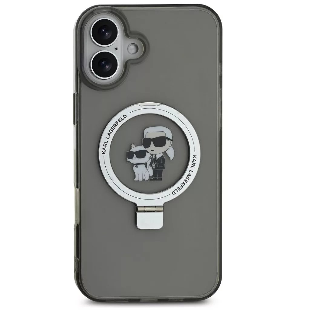 Karl Lagerfeld Ringstand Karl and Choupette iPhone 16 Plus MagSafe tok kitámasztóval, fekete
