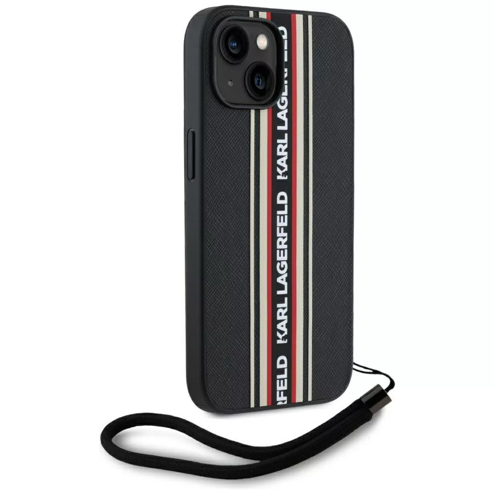 Karl Lagerfeld Saffiano Athleisure Stripes Cord iPhone 15 hátlap tok csuklópánttal, fekete-piros