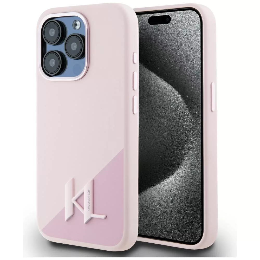 Karl Lagerfeld Silicone Shadow Metal Initial iPhone 15 Pro hátlap tok kameravédelemmel, MagSafe, rózsaszín