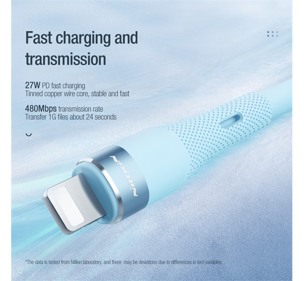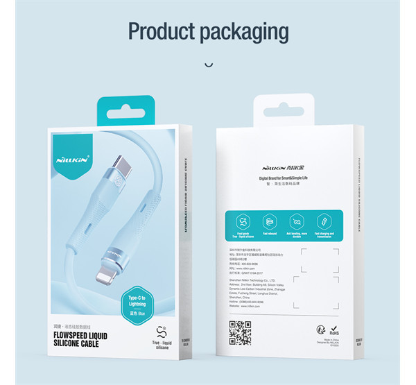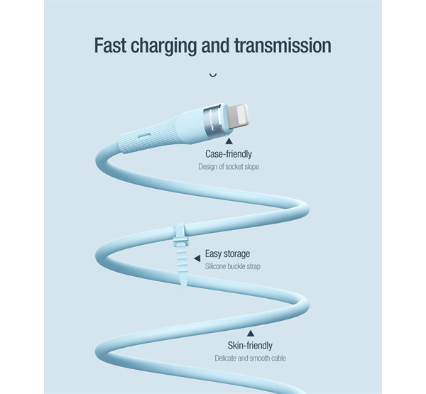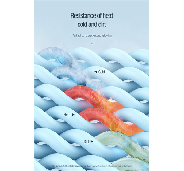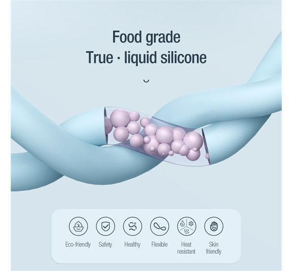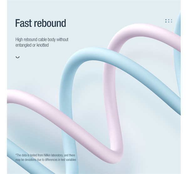 A kábeltest kiváló minőségű folyékony szilikon anyagból készült, amely nagyon puha és gyengéd a bőréhez. Erős rugalmassággal, könnyű tárolhatósággal, hő-, hideg- és szennyeződésállósággal, repedés nélküli technológiával, és sárgulás nélküli hosszú távú használattal rendelkezik; Tartósabb hajlítási ellenállás az integrált fröccsöntési folyamat és a hálós vég megerősítése révén; Vastagított, ónozott rézhuzal szerkezet a hatékony átvitel és a gyors töltés érdekében.