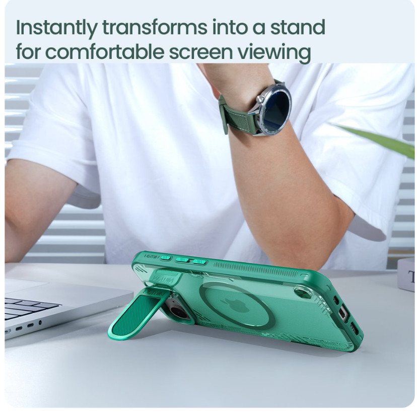 - Felhajtható fedél a kamera lencséjének védelmére, amely állványként is használható.