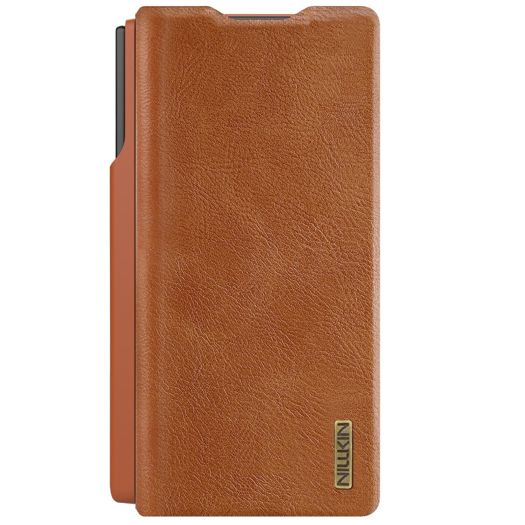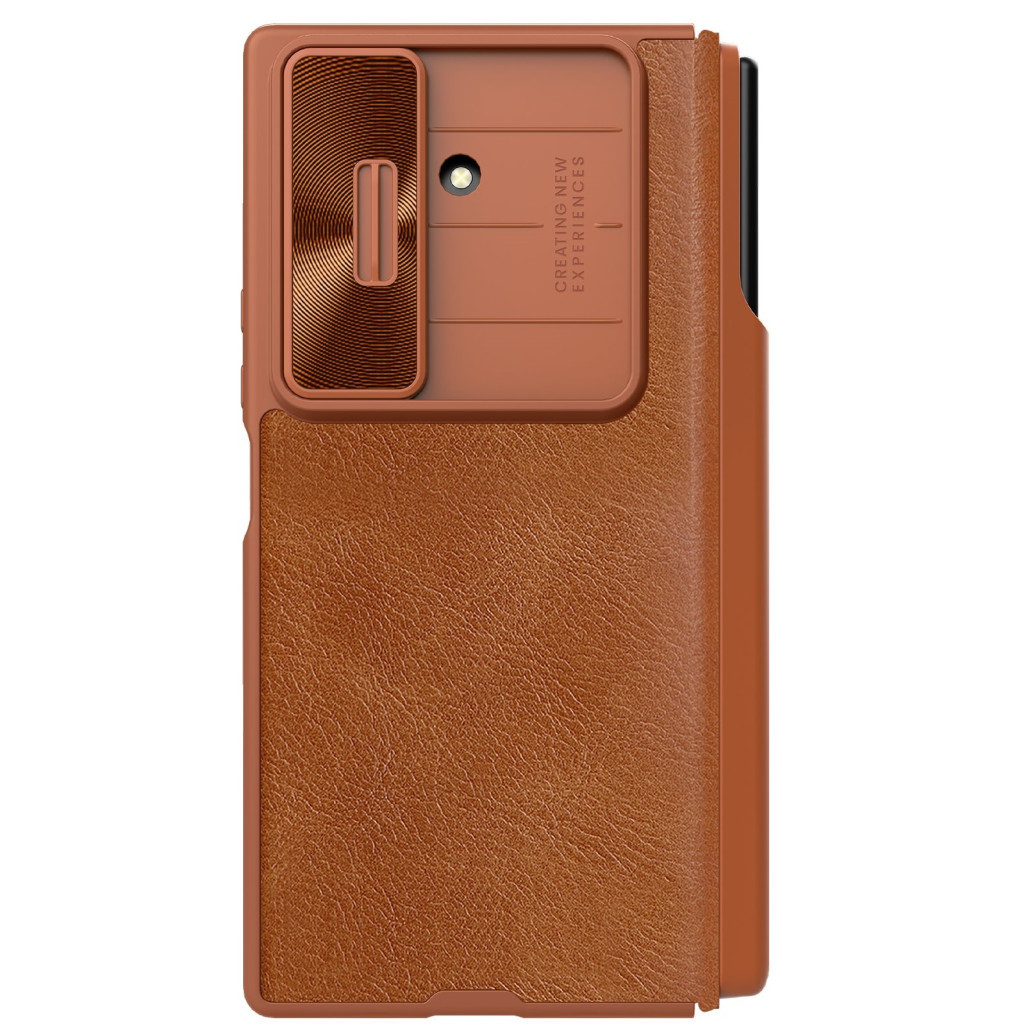 Nillkin Qin Pro Samsung Galaxy Z Fold 7 bőr flip tok S-Pen / kártyatartóval, csúsztatható kameravédővel, barna