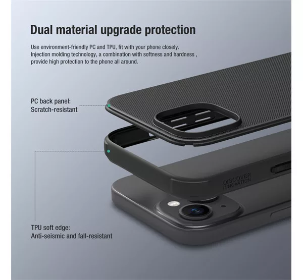 A Nillkin tok matt borítása nagyfokú precízitással készült, importált környezetbarát PC-anyagokból. A tok mindkét oldalán pormentes matt UV festési technológiával van bevonva, amely tartós, és prémium hatást biztosít. A Nillkin keret elég merev ahhoz, hogy nagyszerű védelmet nyújtson, és elég rugalmas, hogy ne törjön el. A felület vízálló és porálló. Emellett nem gyűjti az ujjlenyomat foltokat vagy csúszásnyomokat.