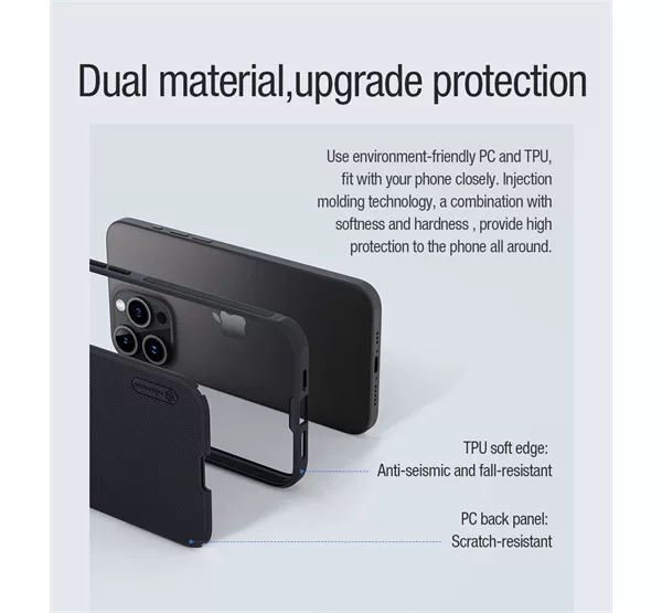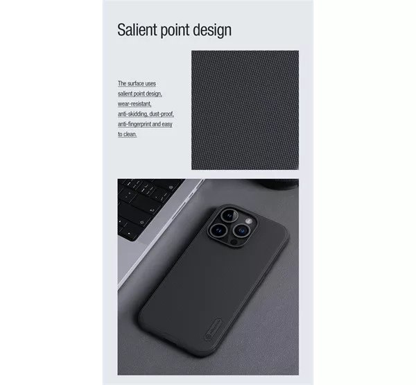 A Nillkin tok matt borítása nagyfokú precízitással készült, importált környezetbarát PC-anyagokból. A tok mindkét oldalán pormentes matt UV festési technológiával van bevonva, amely tartós, és prémium hatást biztosít. A Nillkin keret elég merev ahhoz, hogy nagyszerű védelmet nyújtson, és elég rugalmas, hogy ne törjön el. A felület vízálló és porálló. Emellett nem gyűjti az ujjlenyomat foltokat vagy csúszásnyomokat.