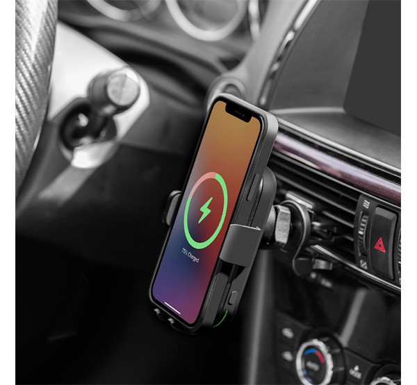 Ez a vezeték nélküli töltéssel ellátott autós tartó intelligens automatikus rögzítő karokkal rendelkezik. Egyszerűen helyezze a telefont a tartóba, a technológia pedig gondoskodik a többiről.