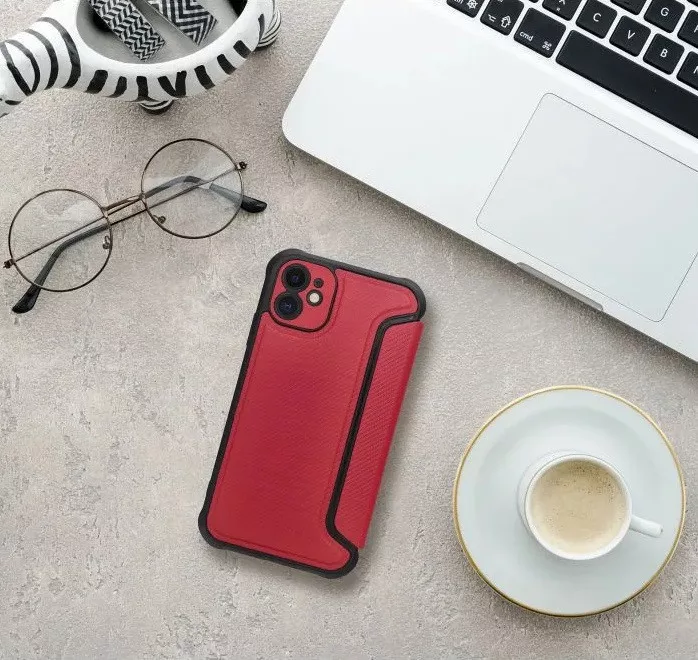 Samsung Galaxy A16 4G / A16 5G SM-A165F / A166B, Oldalra nyíló tok, légpárnás sarok, bőrhatású, karbon minta, Razor Book, piros