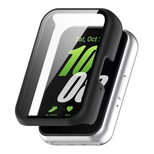 Samsung Galaxy Fit3 SM-R390, Műanyag védőkeret, kijelzővédő üveggel, közepesen ütésálló, szíj nélkül, fekete