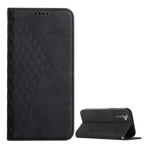 Samsung Galaxy S22 Plus 5G SM-S906, Oldalra nyíló tok, bőrhatású, stand, 3D rombusz minta, fekete