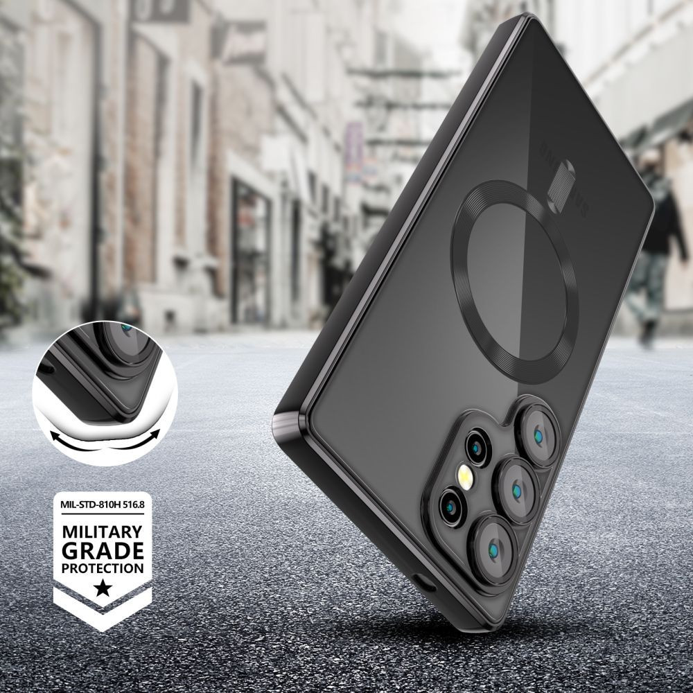 Samsung Galaxy S25 Ultra SM-S938, Műanyag hátlap védőtok + szilikon keret, közepesen ütésálló, Magsafe töltővel kompatibilis, fényes keret, Magflex Magsafe, átlátszó/fekete