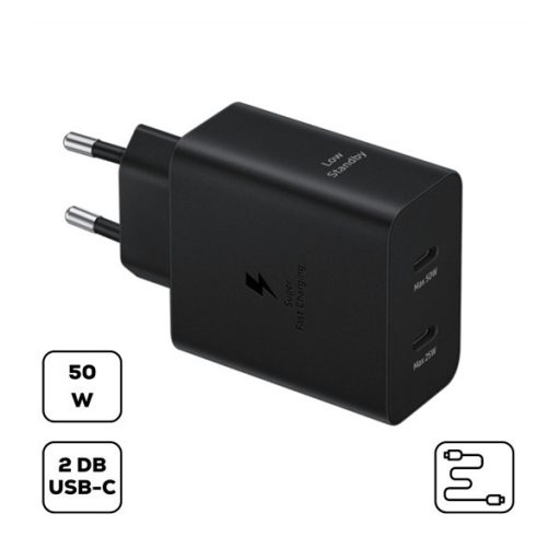 Samsung hálózati adapter 2xUSB-C + USB-C kábellel, PD, 50W, fekete