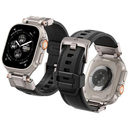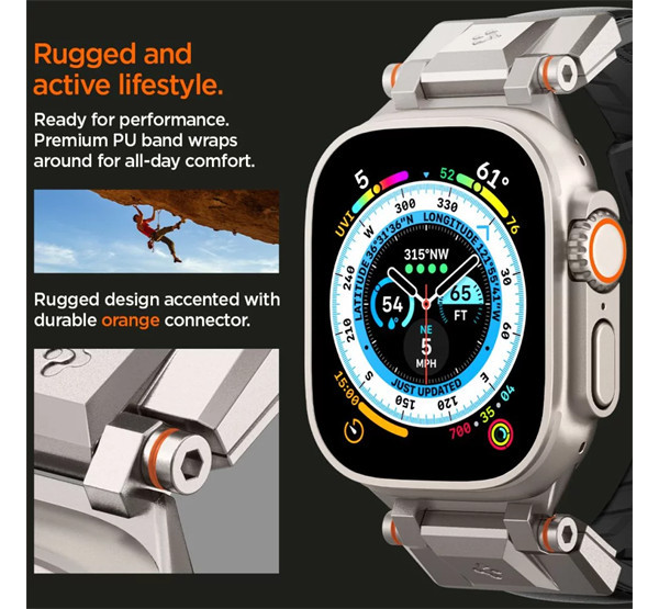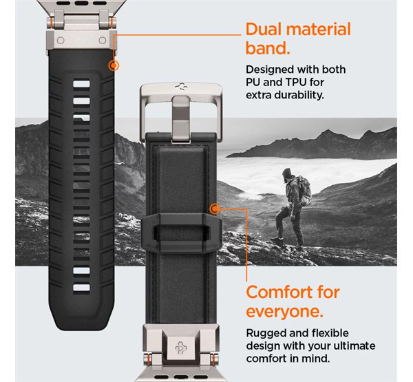 A Spigen DuraPro Armor szíj azok számára készült, akik a tartósságot és a stílust egyaránt fontosnak tartják. Az innovatív anyagkombináció, amely TPU-t és nylont ötvöz, egy kétrétegű szíjat eredményez, amely nemcsak strapabíró, de kényelmes viseletet is biztosít. A fém csatlakozók és a modern mintázat nemcsak esztétikailag vonzó, de kiváló légáteresztő képességet is nyújt, így intenzív helyzetekben is kényelmes marad. A szíj tökéletesen illeszkedik az Apple Watch Ultra-hoz, a fém csatlakozók színben harmonizálnak a titán tokkal, így stílusosan egészítik ki egymást. A DuraPro Armor nemcsak egy egyszerű kiegészítő, hanem a mindennapi kalandokhoz tervezett, strapabíró és stílusos megoldás, amely lehetővé teszi egyéni stílusod kifejezését és maximális teljesítményt nyújt bárhol, ahol szükséged van rá.