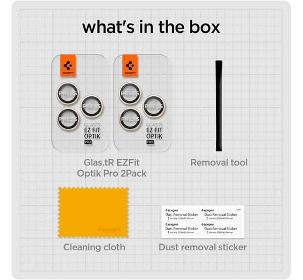 A Spigen "tR EZ Fit Optik Pro" egy edzett üvegből készült kameravédő fólia, amely kifejezetten az okostelefonok kameráinak védelmére lett tervezve. Az "EZ Fit" tálcával ellátott termék segít a pontos és egyszerű telepítésben, és a 9H keménységű üveg kiváló védelmet nyújt a karcolásokkal szemben. Az oleofób bevonat csökkenti az ujjlenyomatok megjelenését, így tiszta marad a lencse.