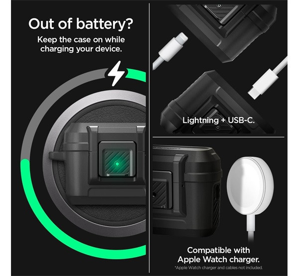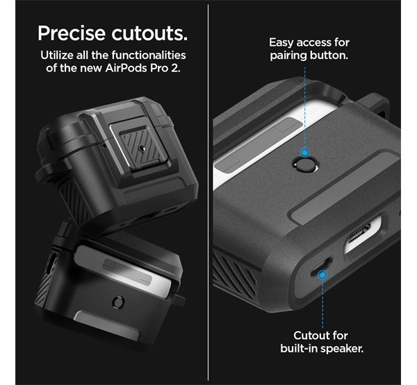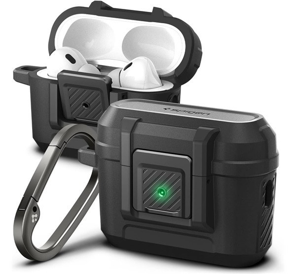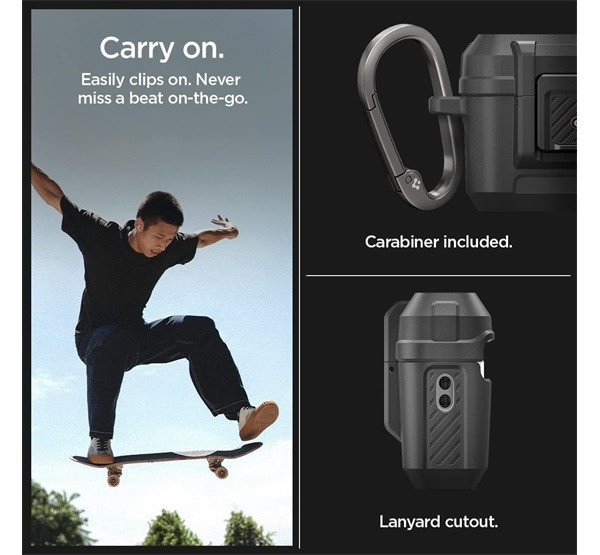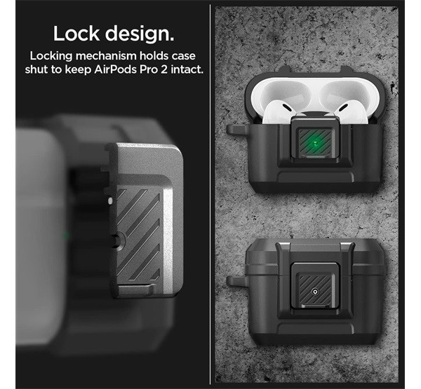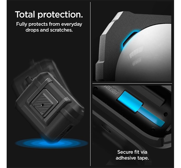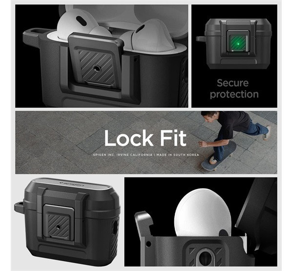 A Spigen Armored Lock Fit háza biztonsági zárszerkezettel rendelkezik, amely bármilyen körülmények között megvédi készülékét. A Hybrid Polymer technológián alapuló többrétegű hibrid konstrukció hatékony védelmet nyújt a karcolások, por és ujjlenyomatok ellen. A tok tökéletesen illeszkedik, és gyors hozzáférést biztosít a reset gombhoz, valamint lehetőséget ad a fejhallgató töltésére anélkül, hogy eltávolítaná a tokot. A készletet egy praktikus karabinerrel egészítették ki, amely lehetővé teszi a fejhallgató könnyű rögzítését kulcscsomóra vagy övre, így megakadályozva az elejtést vagy elvesztést. A hibrid kialakítás könnyen összeszerelhető és szétszerelhető, maximális védelmet és funkcionalitást biztosítva.