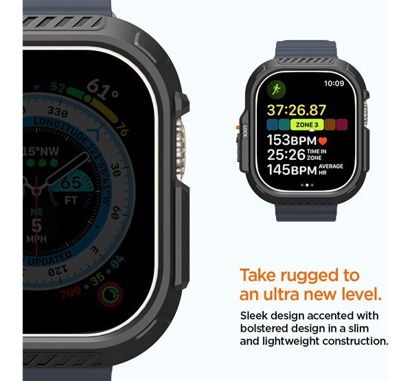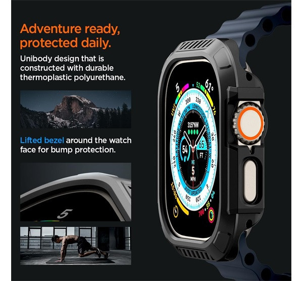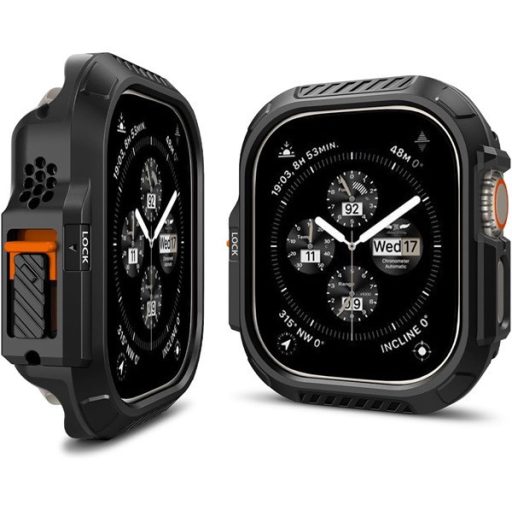 A Spigen Lock Fit Apple Watch Ultra 49mm tok fekete színben prémium minőségű, tartós anyagból készült, amely hibrid polimer technológiát alkalmaz a maximális védelem érdekében. Elegáns és masszív kialakításával kitűnik, narancssárga akciógomb-burkolattal, amely stílusos megjelenést kölcsönöz az órának. A Smart Lock technológia révén biztonságosan rögzíti az akciógombot, biztosítva a könnyű és megbízható használatot. A tok gyorsan és egyszerűen telepíthető, és kizárólag az Apple Watch Ultra készülékkel kompatibilis. Anyaga kemény polikarbonát (PC), amely hosszan tartó védelmet nyújt.