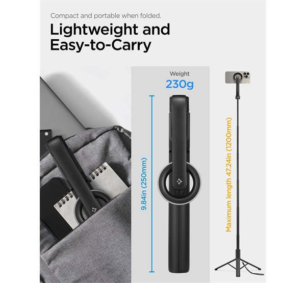 Fedezd fel a tökéletes szelfik varázslatát a fekete Spigen S580W Long MagSafe szelfibot és tripod állvánnyal, amely Bluetooth kioldóval még kényelmesebbé teszi a fotózást. Kompatibilis az összes iPhone 12-től iPhone 16-ig terjedő készülékkel, így mindig profi minőségű képeket készíthetsz! Légy stílusos és praktikus minden pillanatban!