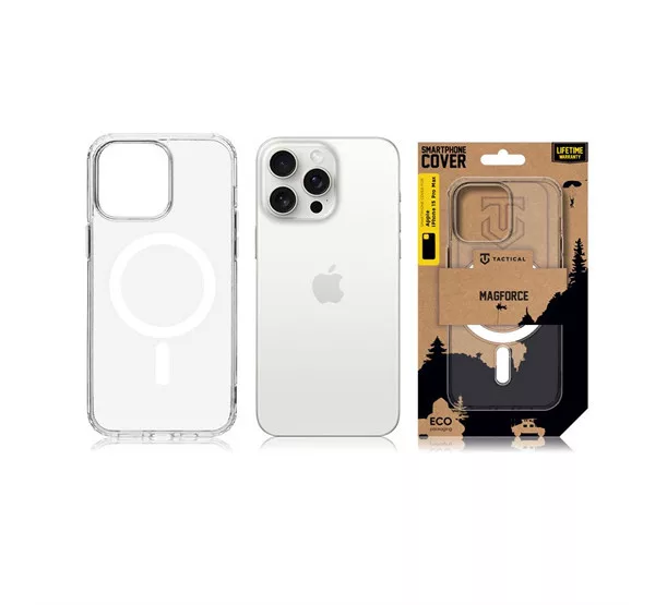 A Tactical MagForce egy vékony, átlátszó PC/TPU hátlapvédő, amely tökéletesen illeszkedik a telefonra. A tok két anyagból áll: a hátoldalon erős polikarbonát található, az oldalaknál pedig rugalmas TPU anyag. Különlegessége, hogy egy erős mágnessel rendelkezik, amely kompatibilis az Apple MagSafe kiegészítőkkel. A polikarbonát anyagnak köszönhetően a tok nem sárgul be a telefon töltése közben keletkező hő miatt. A tok teljesen védi a telefon hátulját, oldalait és sarkait, biztosítva a védelmet az esések és a mindennapi használat során is. Nagy előnye, hogy pontosan illeszkedik a készülékhez, miközben minden gomb és csatlakozó könnyen hozzáférhető marad. Emellett a telefon legsebezhetőbb pontjait, például a sarkakat különösen védi. Az enyhén megemelt szélek pedig megakadályozzák, hogy a kijelző megsérüljön, amikor a készüléket képernyővel lefelé helyezzük le. A Tactical márka szokásához híven a termék csomagolása teljes mértékben újrahasznosított papírból készült.