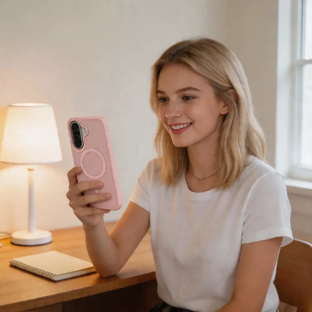 A kamera és a kijelző körül megemelt peremek védik a legérzékenyebb részeket a sík felületekkel való érintkezéstől. A beépített mágneses gyűrű teljes MagSafe-kompatibilitást biztosít, így használhatók a mágneses kiegészítők is. A precíz kivágások teljes hozzáférést nyújtanak az összes porthoz, gombhoz és hangszóróhoz.