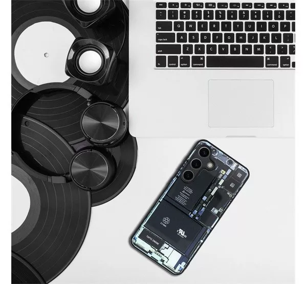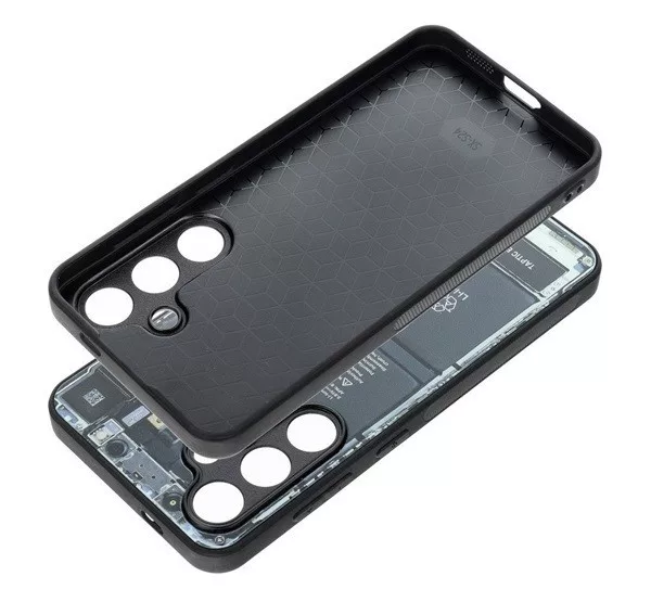 A hátlapot a telefon belsejét utánzó minta különbözteti meg . A tok szokatlan kialakítását a széleken és a belső oldalon elegáns matt fekete kivitel egészíti ki.