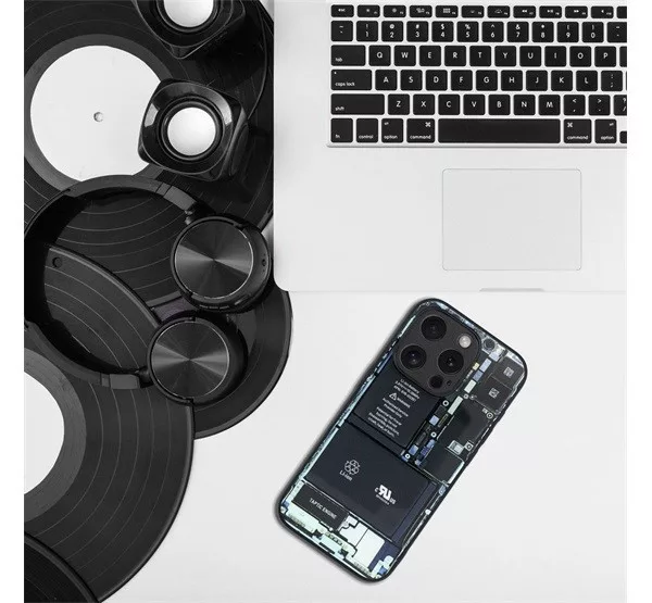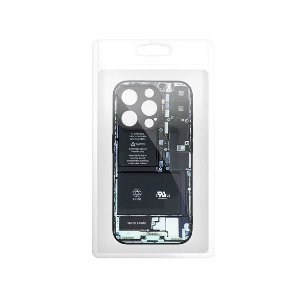 A hátlapot a telefon belsejét utánzó minta különbözteti meg . A tok szokatlan kialakítását a széleken és a belső oldalon elegáns matt fekete kivitel egészíti ki.