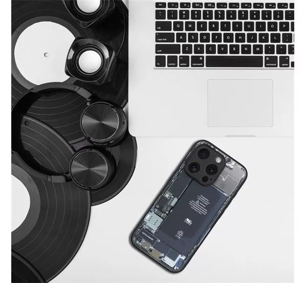 A hátlapot a telefon belsejét utánzó minta különbözteti meg . A tok szokatlan kialakítását a széleken és a belső oldalon elegáns matt fekete kivitel egészíti ki.