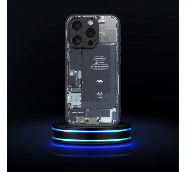 A hátlapot a telefon belsejét utánzó minta különbözteti meg . A tok szokatlan kialakítását a széleken és a belső oldalon elegáns matt fekete kivitel egészíti ki.