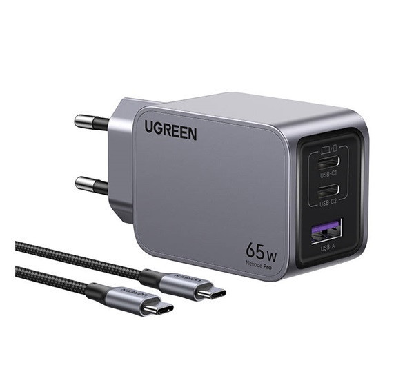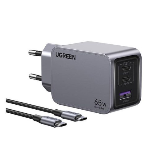 Ugreen Nexode Pro USB-A + 2x USB-C hálózati töltő adapter + USB-C kábel, 65W, 1.5m, fekete