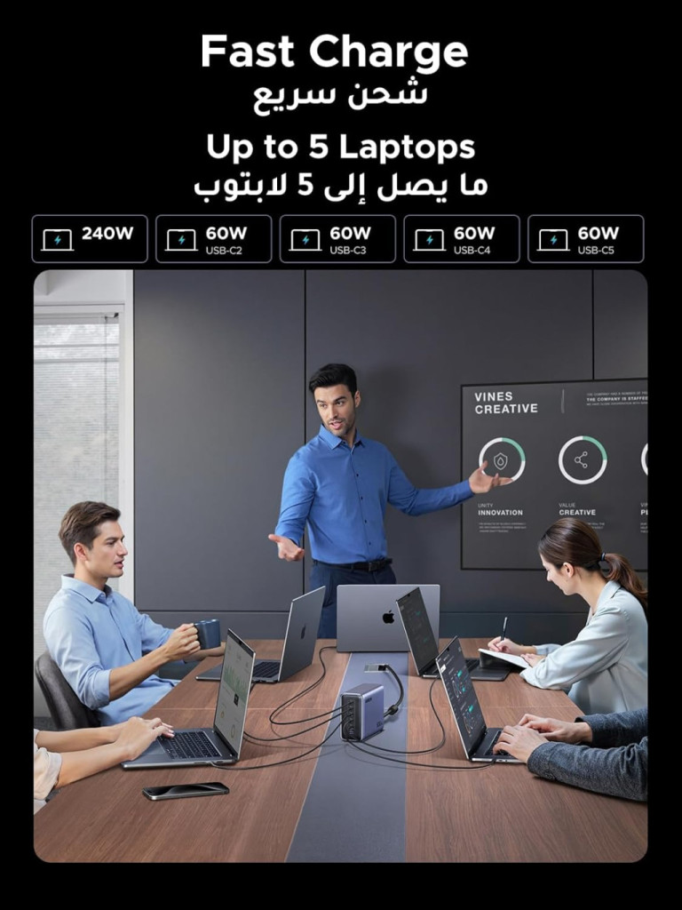 A Nexode X759 hat portot kínál - öt USB-C és egy USB-A portot. Ez lehetővé teszi, hogy egyszerre több eszközt is töltsön. Ez a konfiguráció azt jelenti, hogy egyszerre tölthetsz laptopokat, telefonokat, táblagépeket, fejhallgatókat és egyéb kiegészítőket anélkül, hogy több hálózati adaptert kellene használnod. Ez egy praktikus megoldás, amely lehetővé teszi, hogy szervezett maradjon, és kényelmesen kezelje az áramellátást az íróasztalán.