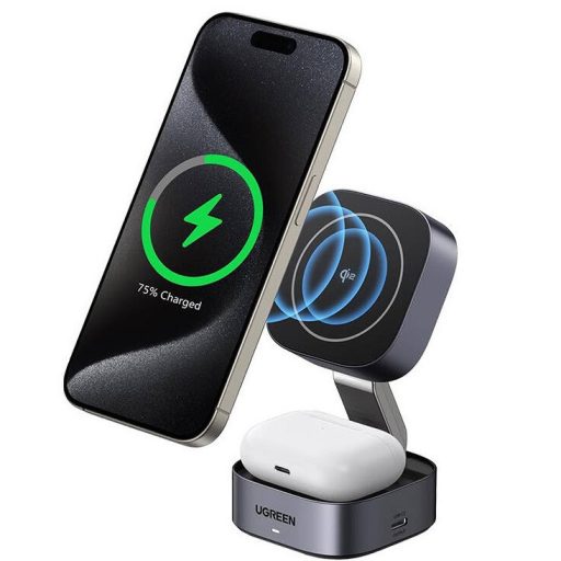 A Qi2 töltőállvány és az 1x1M USB-C töltőkábel kombinációja nemcsak a töltő megjelenését teszi rendezetté, hanem mobiltelefon-állványként is használható. Ez egy érdekes megoldás, amely sok helyzetben jól jön, és nagyobb kényelmet biztosít a használatból (az USB-C töltő nem tartozék).
