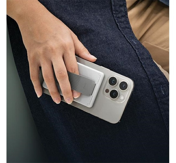 A Uniq Heldro ID egy sokoldalú, mágneses kártyatartó, amely egyben telefontartóként és kényelmes fogásként is funkcionál.