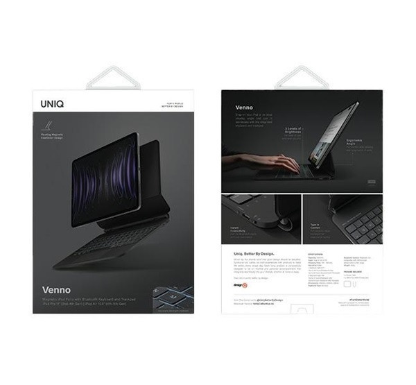 A Uniq Venno egy vékony és kompakt mágneses folio tok, amely integrált Bluetooth billentyűzettel és trackpaddal rendelkezik. A mágneses rögzítésnek köszönhetően könnyedén csatlakoztatható az iPad-hez, több nézési szöget biztosítva. Az ergonomikus kialakítás kényelmes munkavégzést tesz lehetővé, hosszú üzemidővel és LED-es töltésjelzőkkel.