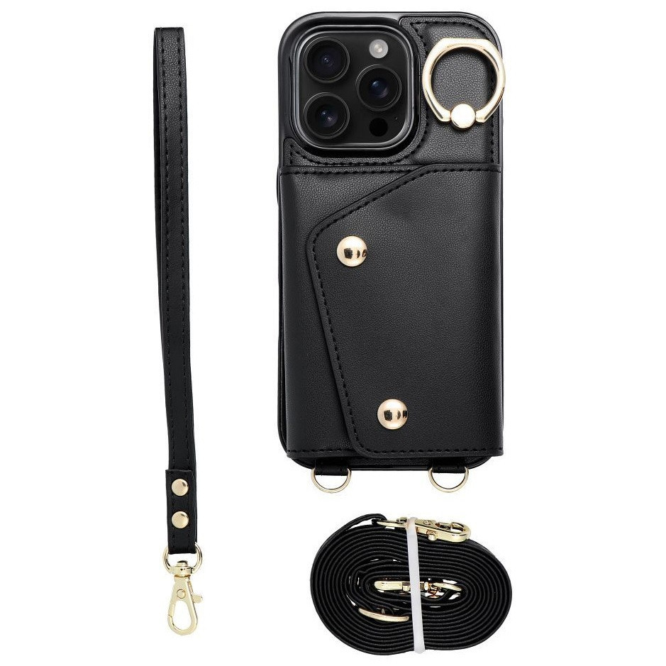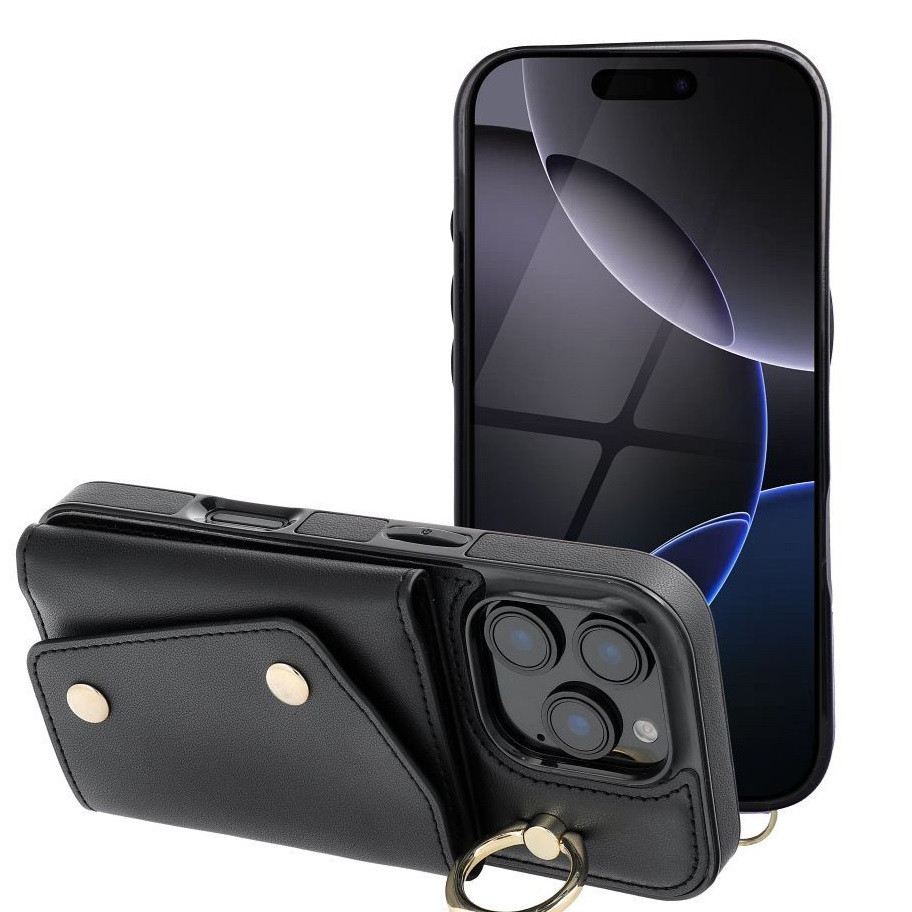 Wonder iPhone 13 kártyatartós tok gyűrűs kitámasztóval, csuklóra / vállra akasztható pánttal, fekete