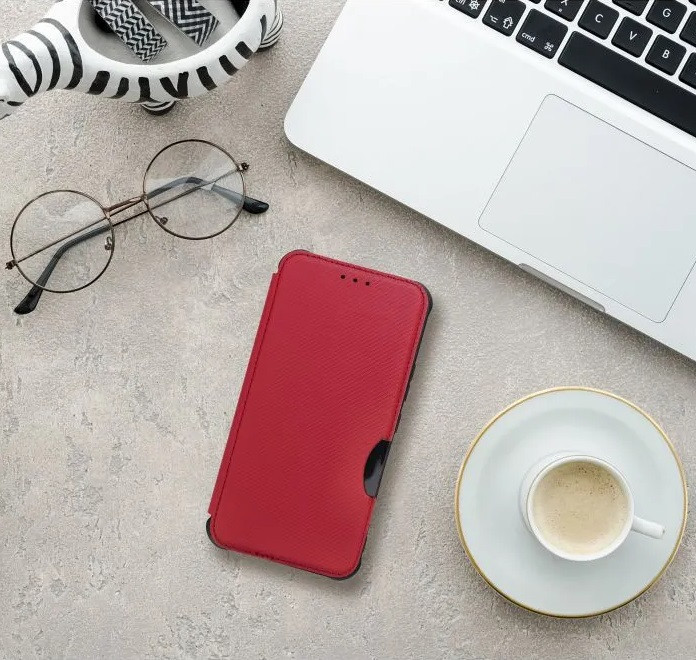 Xiaomi Redmi 14C / Poco C75, Oldalra nyíló tok, légpárnás sarok, bőrhatású, karbon minta, Razor Book, piros
