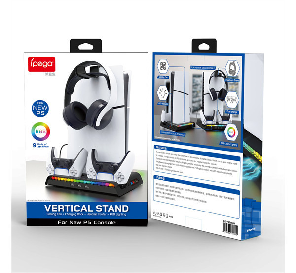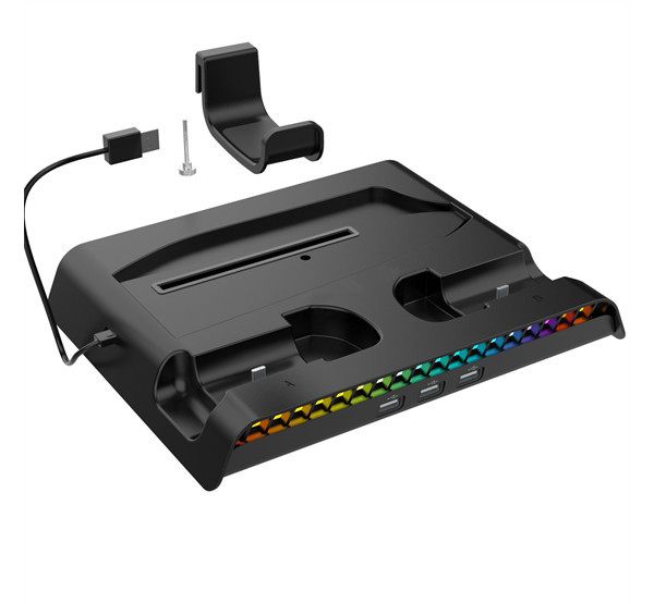 Az állvány két kontroller töltőjével, praktikus fejhallgató-állvánnyal, három USB-porttal és RGB háttérvilágítással is rendelkezik.